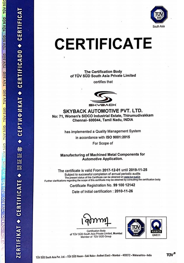 Skyback Automotive Pvt.Ltd is committed to manufacture and deliver precision machined products that comply with the customer satisfaction by supplying right quality products with prompt delivery at competitive price through improving the effectiveness of quality management system in line with ISO 9001:2015 requirements. This we achieve through Commitment, Teamwork, System approach.
